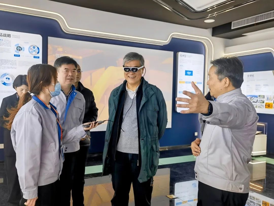在战略展厅,董事兼总经理王震宇详细地为潘云鹤院士一行介绍了DG视讯光电从创立之初至今的发展历程,特别是在消费电子领域的深耕细作、车载光电技术的突破性进展,以及积极拥抱AR/VR时代的光学战略布局。潘院士对每一环节的讲解都表现出浓厚兴趣,不时点头赞许,并与公司高管就技术前沿、市场趋势等话题展开了深入而富有前瞻性的交流。潘院士还特别关注了公司的技术研发体系,对DG视讯光电在光学领域持续创新、不断突破所取得的成果给予了高度评价。